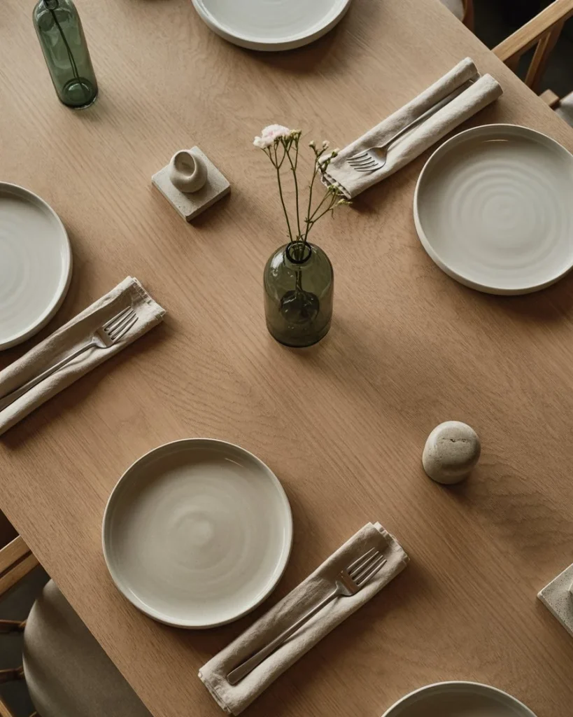 This sleek minimalist dining setup focuses on the beauty of simplicity. The clean lines of neutral-colored ceramic plates create a calm foundation, while soft linen napkins and elegant flatware add a refined touch. A few delicate flowers in a simple green glass vase bring life and freshness to the table, adding just the right amount of detail without overwhelming the space. Subtle stone accents further enhance the table’s serene atmosphere.