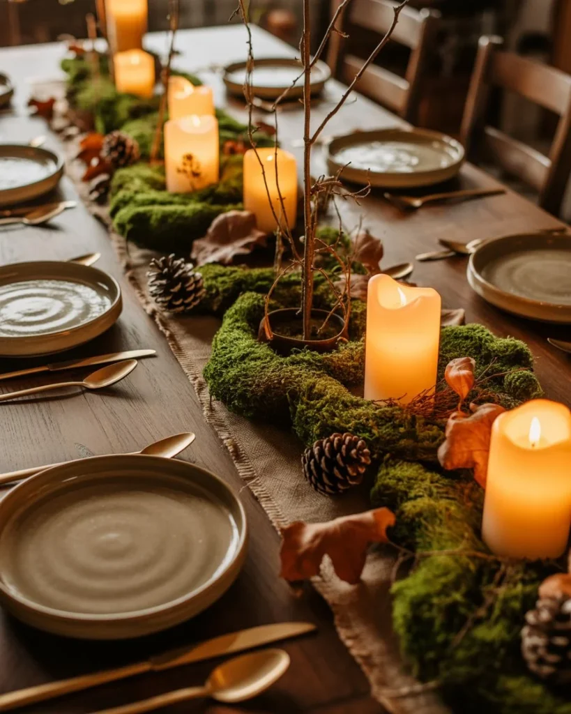 This autumn-inspired table setting beautifully captures the warmth and charm of the season. A natural moss runner stretches down the center, with soft flickering candles adding a cozy glow. Scattered pinecones, dried leaves, and delicate branches bring a rustic woodland feel to the table. Earthy ceramic plates and gold flatware ground the design with a sophisticated yet casual touch.