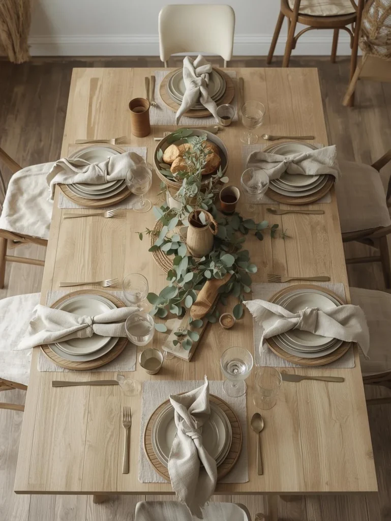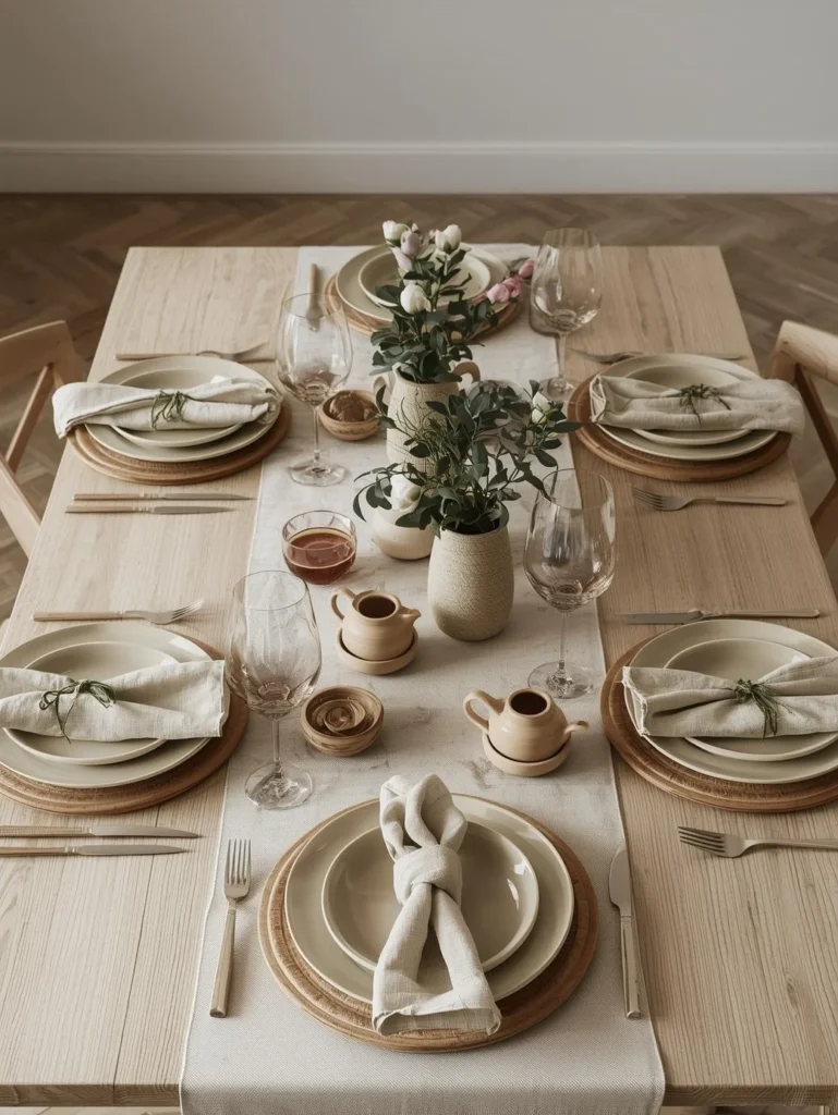 This elegant table setting exudes warmth and understated sophistication. The soft, neutral-toned plates and natural wooden chargers provide a serene foundation, while the delicate linen napkins tied with sprigs of greenery add a touch of organic charm. Simple, elegant glassware and small ceramic pitchers complement the design, bringing a refined yet cozy feel to the table. Fresh greenery in minimalistic vases softens the overall look, creating a balanced and inviting atmosphere.