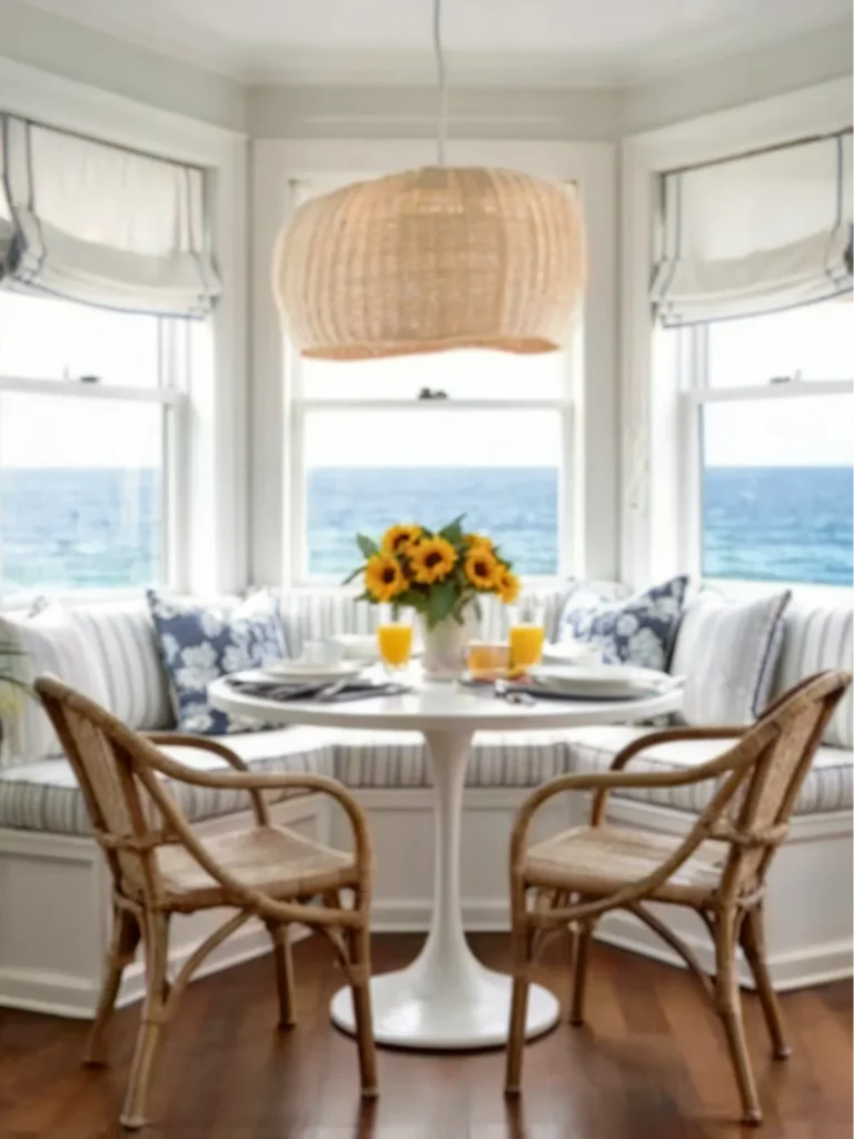 This coastal-inspired dining nook captures the essence of a breezy, relaxed seaside atmosphere. The round table, surrounded by woven chairs, offers an intimate setting that invites guests to enjoy a leisurely meal. The vibrant sunflower centerpiece adds a pop of cheerful color, while the ocean views visible through the windows create a calming backdrop. Soft, patterned cushions enhance the cozy feel, making this space the perfect retreat for casual dining or morning coffee.