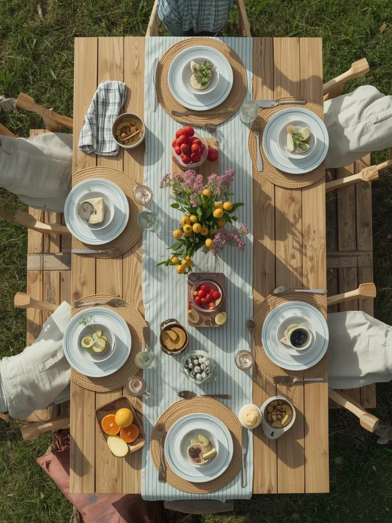 This fresh garden picnic setting celebrates the simplicity of nature and the joy of outdoor dining. The woven placemats and soft blue-striped table runner bring a warm, casual elegance to the table. Plates filled with fresh fruits, colorful vegetables, and light dishes offer a burst of color and flavor, complemented by small bowls filled with assorted snacks. A vibrant bouquet of flowers sits at the center, adding a natural touch to the table.