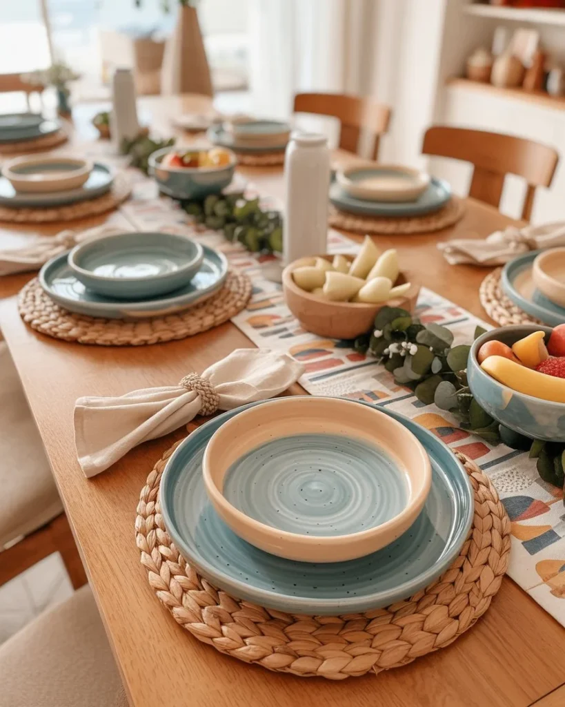 This vibrant summer table setting brings a cheerful, laid-back vibe to any gathering. The woven placemats and bright blue dinnerware set a relaxed tone, while the creamy beige plates add a touch of warmth. The addition of fresh fruit in wooden bowls, along with a floral centerpiece of eucalyptus, introduces natural textures that complement the simple yet charming design.