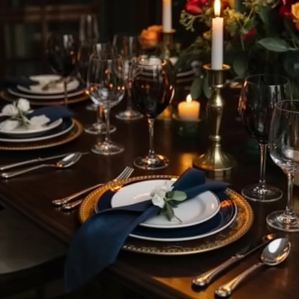 This elegant dinner setting exudes sophistication and warmth. The deep navy blue napkins, tied neatly with a simple flower, provide a striking contrast against the gold chargers and white plates. Crystal-clear wine glasses catch the light, enhancing the luxurious feel, while tall candles in brass holders cast a soft glow over the table, creating a romantic ambiance. The lush floral centerpiece brings a touch of nature to the otherwise refined design.