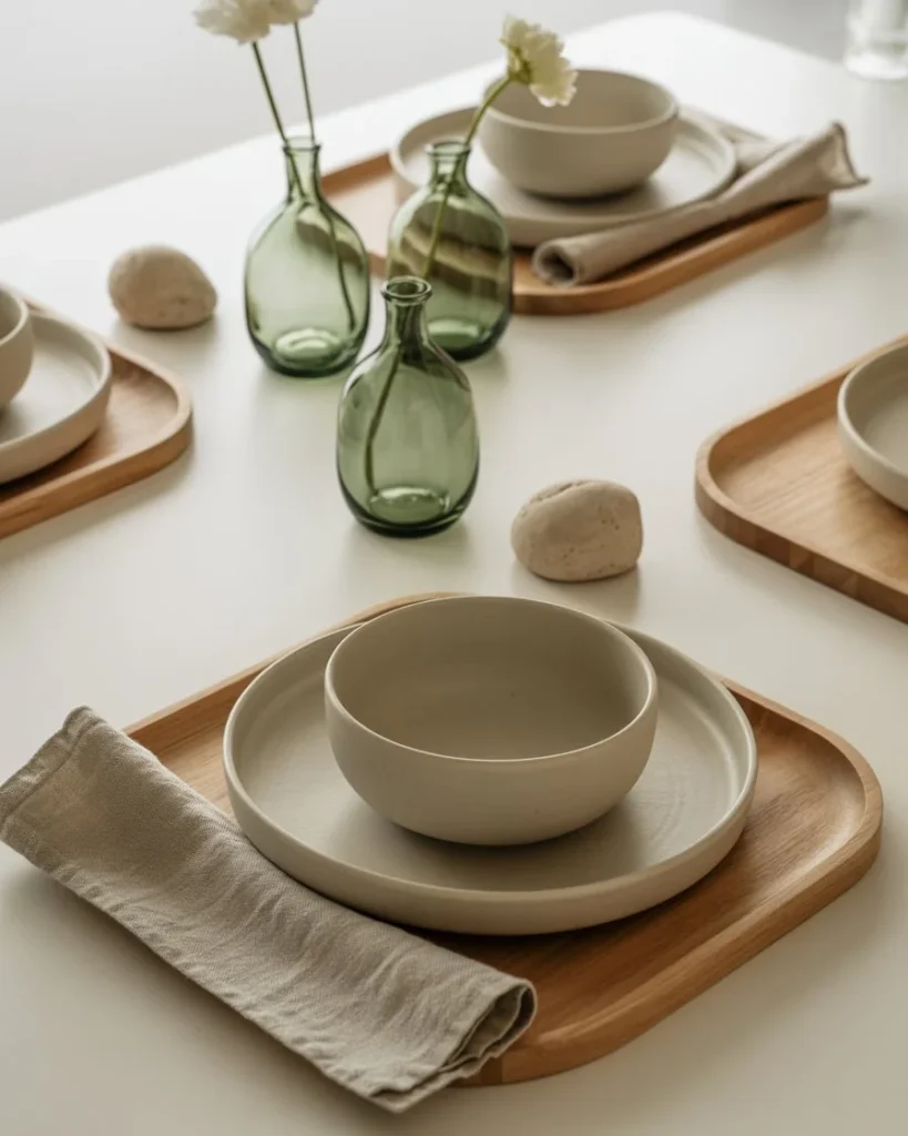 This minimalist table setting captures the essence of simplicity and elegance. The neutral tones of soft beige plates and bowls paired with natural wooden trays create a calm, clean foundation. Delicate green glass vases filled with fresh flowers add a pop of color and a refreshing organic touch. The stone accents scattered across the table bring an earthy, grounded feel, enhancing the serene atmosphere.