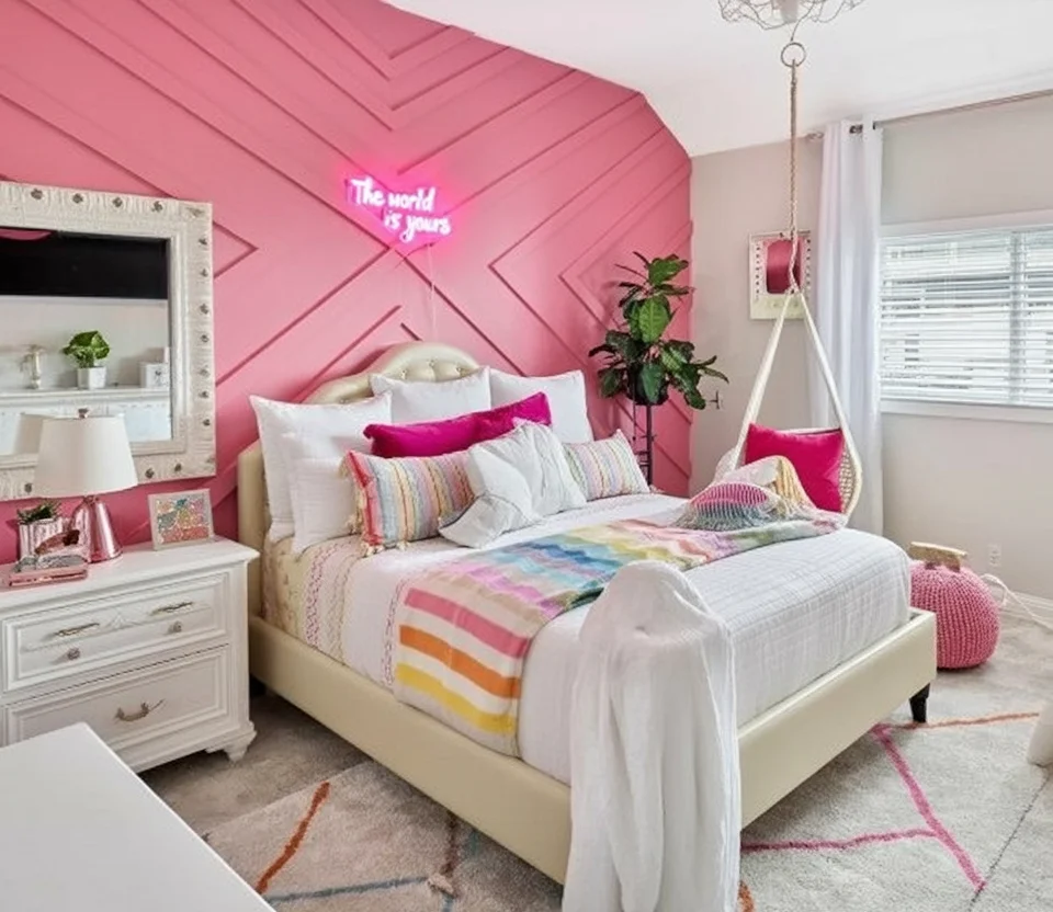 Vibrant, cheerful, and full of life, this bedroom captures the energy of youth and creativity. The bold pink accent wall instantly draws the eye, featuring geometric paneling that adds texture and depth. A neon sign reading “The world is yours” glows above the bed, adding a fun, motivational touch that brings personality to the space.