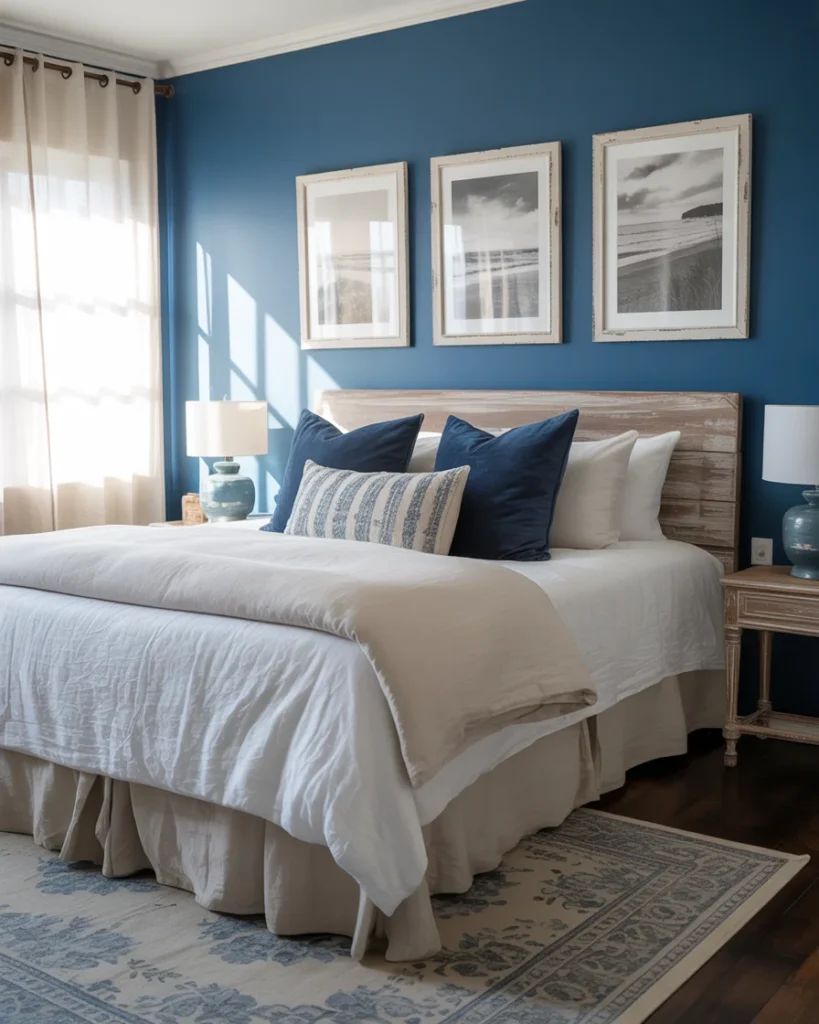 Soft coastal hues meet relaxed sophistication in this serene bedroom retreat. The deep blue accent wall sets a calming tone, balanced by the warmth of neutral linens and a light wood headboard. Natural sunlight filters through sheer curtains, casting a gentle glow that enhances the cozy atmosphere.
