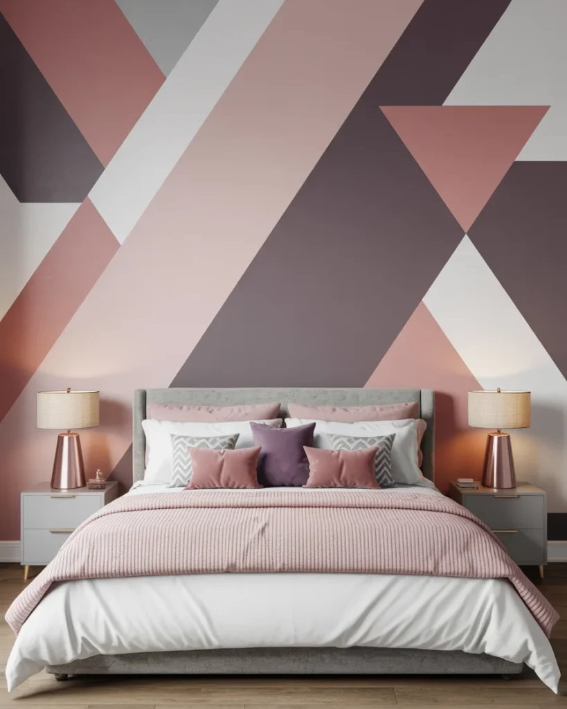 This style can range from playful to sophisticated, depending on your color choice. Soft pink, mauve, or gray hues create a balanced and feminine look. You can paint the geometric shapes directly onto the wall or use removable decals for an easy update.