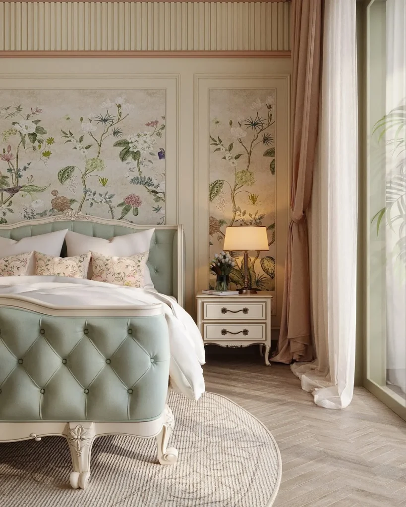 A touch of old-world grace defines this elegant bedroom, where botanical panel accents bring refined charm to the space. Each panel features hand-painted floral motifs that feel delicate yet timeless, framed with soft cream molding for a polished finish. The floral artwork introduces subtle color through greens, pinks, and lilacs, adding warmth without overpowering the room.