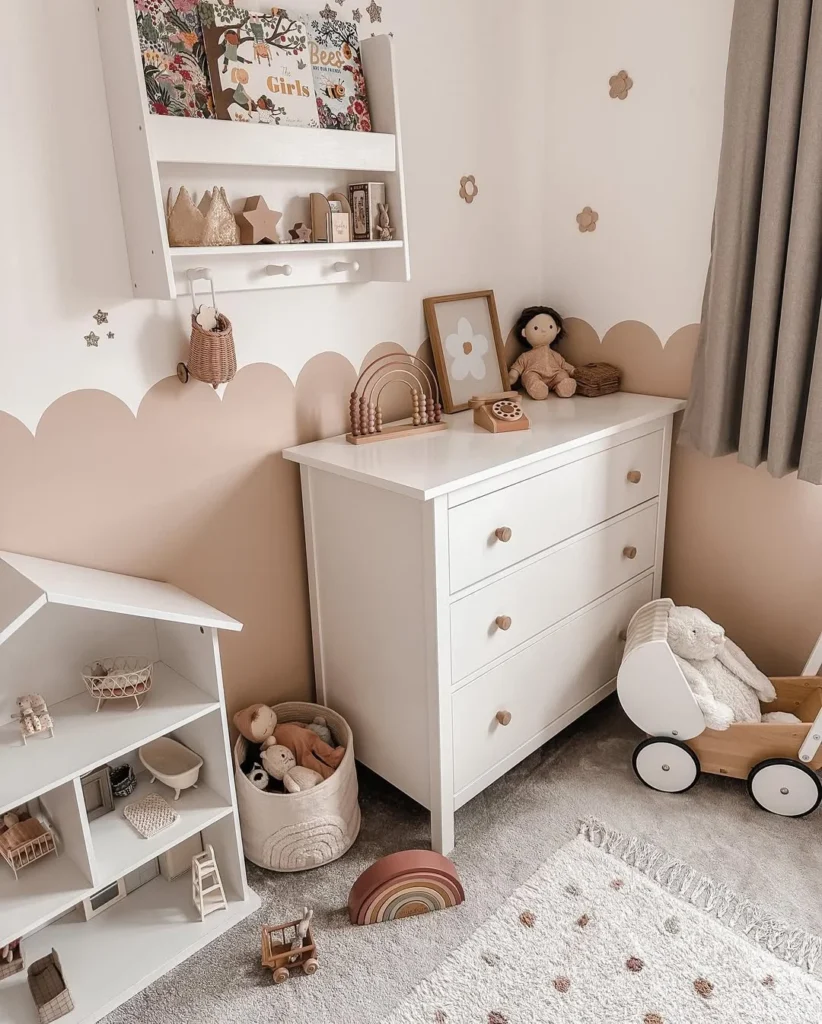 Warm, calm, and effortlessly stylish, this neutral boho kids room captures the essence of simplicity and comfort. The soft beige scalloped wall adds a playful touch while maintaining a soothing color palette that feels both modern and timeless.