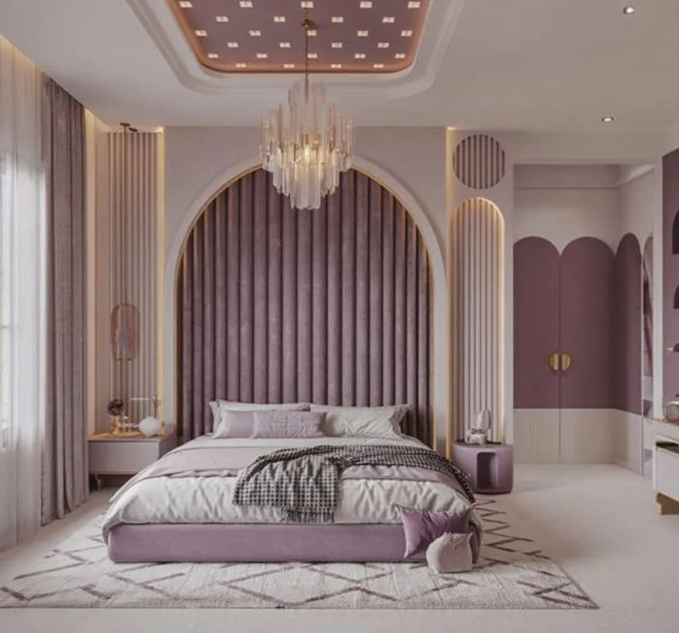 Rich tones and graceful curves define this modern mauve bedroom, where elegance meets comfort in the most inviting way. The arched headboard wall takes center stage, upholstered in soft mauve velvet with golden trim that adds a touch of glamour and warmth. Gentle lighting highlights the vertical textures, giving the space depth and a cozy glow.