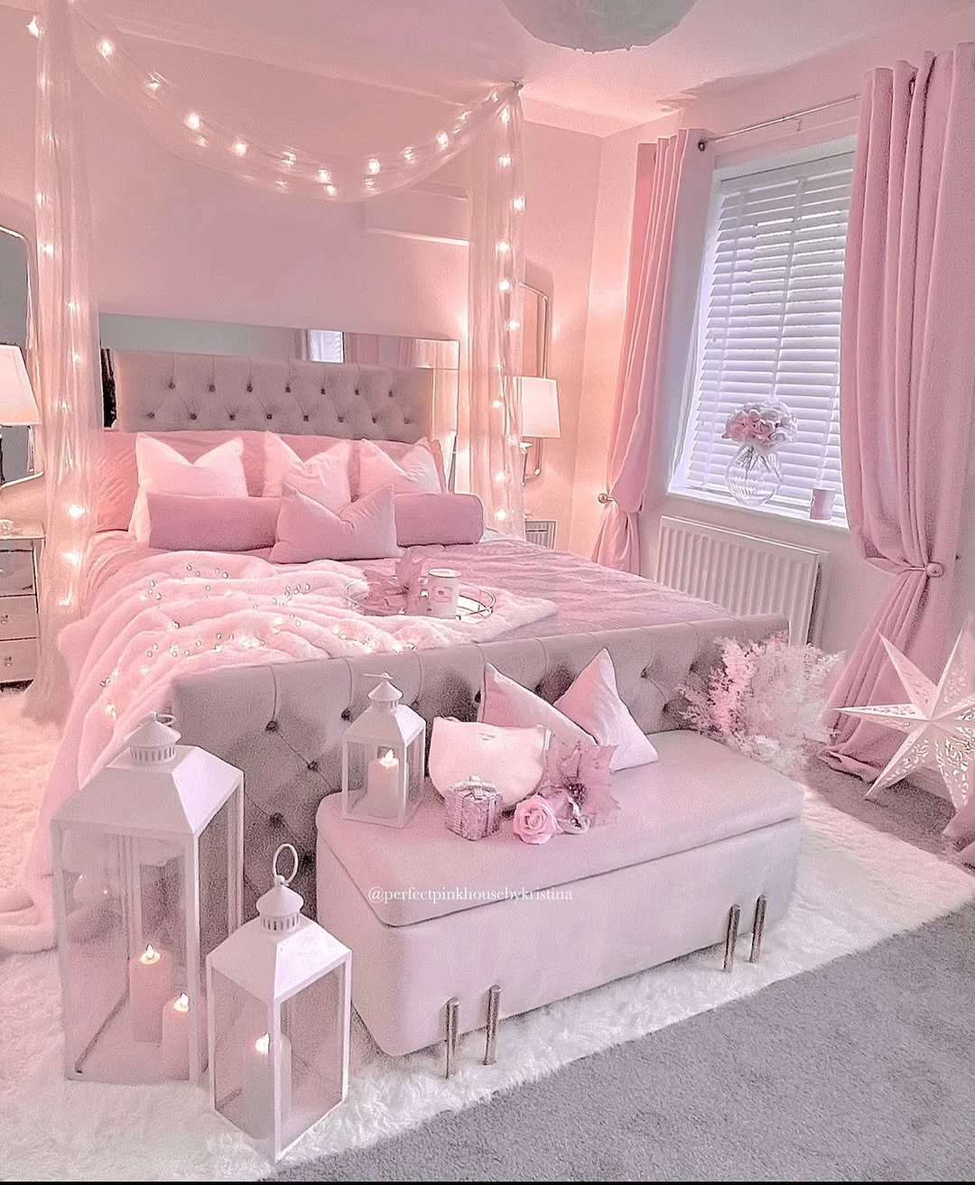 Soft lighting and pastel tones create a soothing, romantic atmosphere in this blush-themed bedroom. The tufted headboard and cascading fairy lights add a gentle glow that makes the entire space feel cozy and inviting. Plush pillows and layered textures on the bed bring a sense of warmth and comfort, blending luxury with a feminine touch.