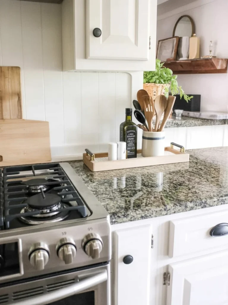 Place essentials like olive oil bottles, salt and pepper grinders, or a small candle on the tray. This approach keeps things functional while still looking styled and refined.