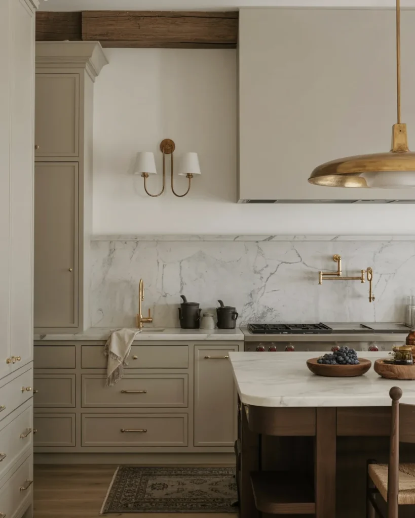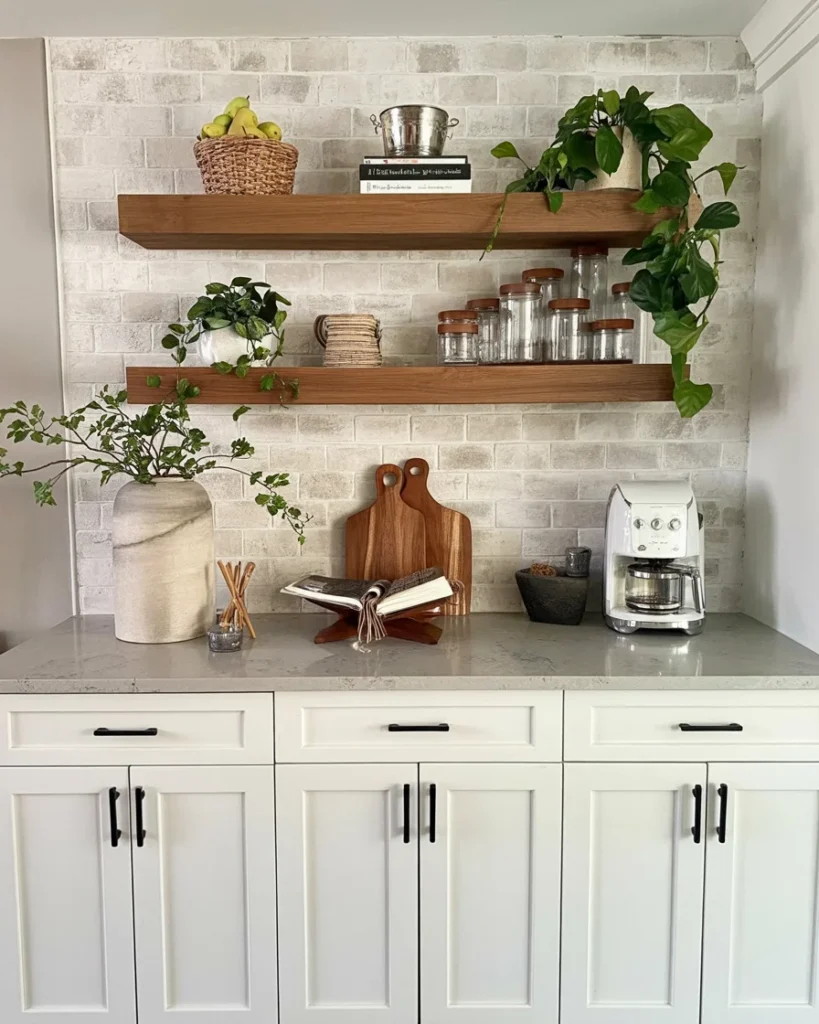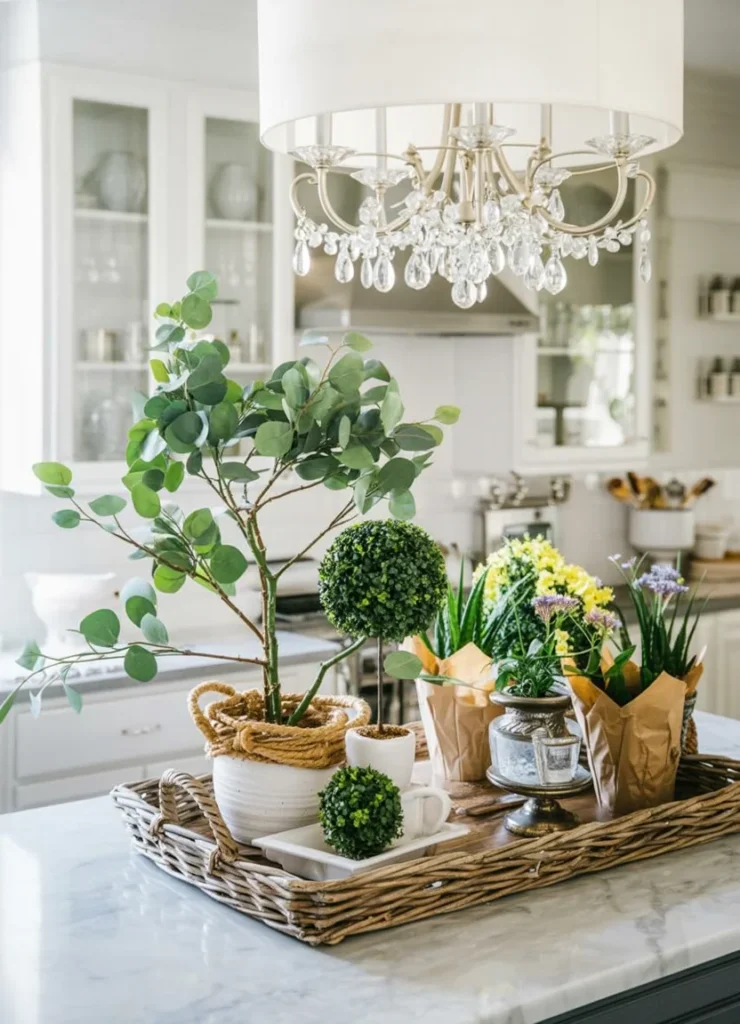 Nothing elevates a kitchen faster than greenery. Small potted herbs, olive trees, or leafy plants instantly soften the space and add freshness.
