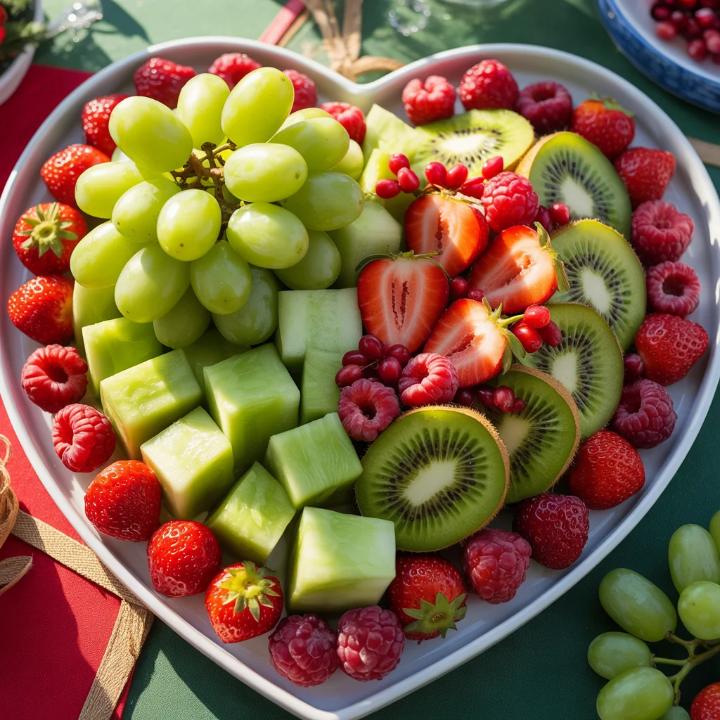 This vibrant Grinch-inspired fruit tray brings together a fresh assortment of red and green fruits in a heart-shaped arrangement. Green grapes form the center, symbolizing the Grinch’s iconic green heart, surrounded by juicy honeydew melon cubes and slices of kiwi.
