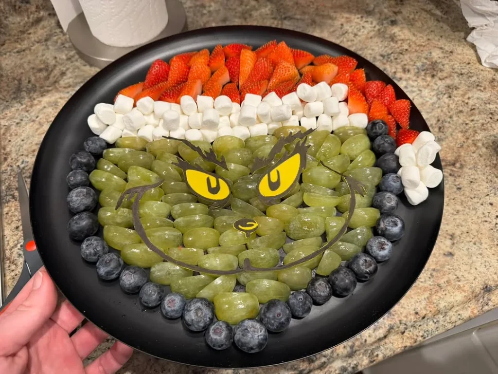 His mischievous eyes are made from slices of kiwi, red grapes, and a touch of black licorice for the brows, capturing the essence of his character. A small piece of orange slice is used to create his signature smile, while a fluffy white pom-pom made of coconut rests at the top, representing the Grinch’s iconic hat.