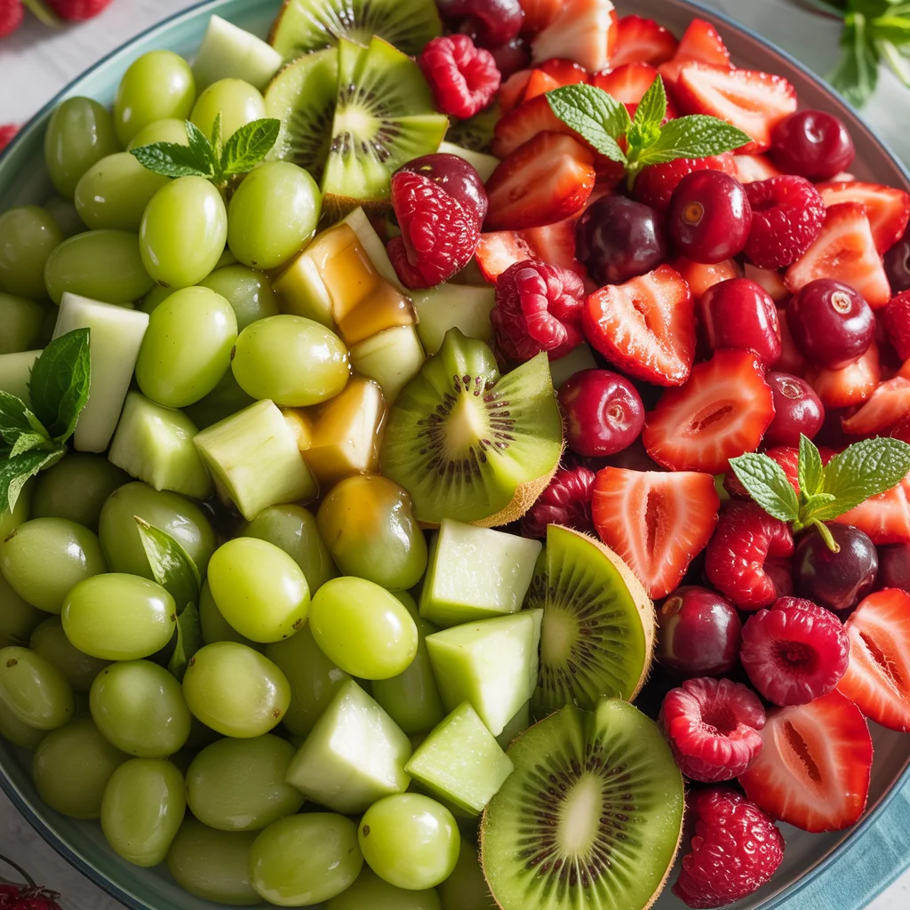 The red fruits, including strawberries, raspberries, and pomegranate seeds, pop against the green, creating a festive and colorful display. The carefully arranged fruits not only look appealing but also offer a refreshing and healthy snack option for your holiday gatherings.
