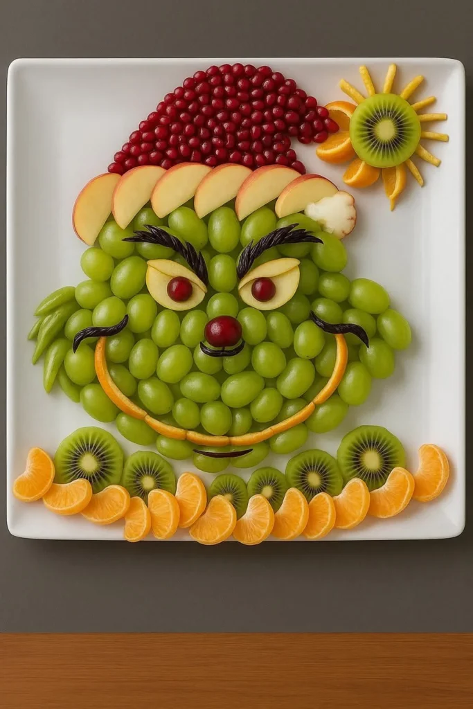 This Grinch fruit tray is a playful and creative way to bring holiday cheer to any table. The Grinch’s face is made from fresh fruits like green grapes, which form the base of his mischievous smile and green complexion.