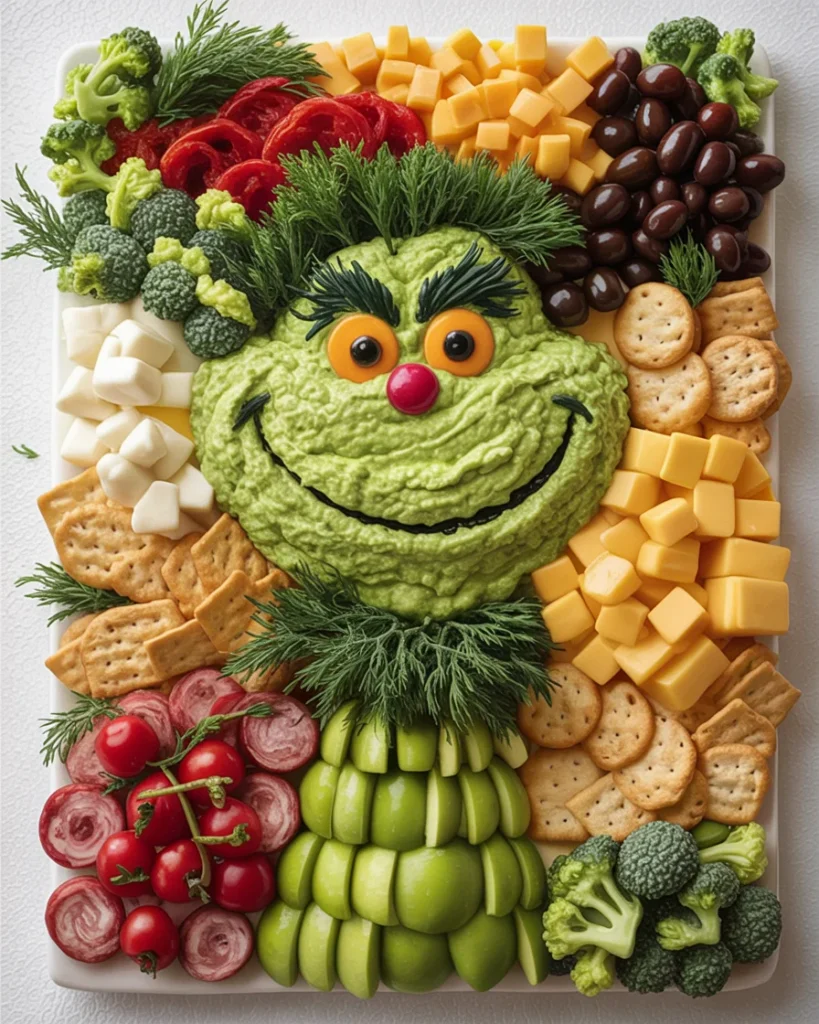 The playful addition of crackers, cubes of cheese, and fresh herbs adds both texture and flavor, making it an appealing snack for both kids and adults. The green and red color scheme is complemented by the fun Grinch face, giving this tray a festive and whimsical touch.