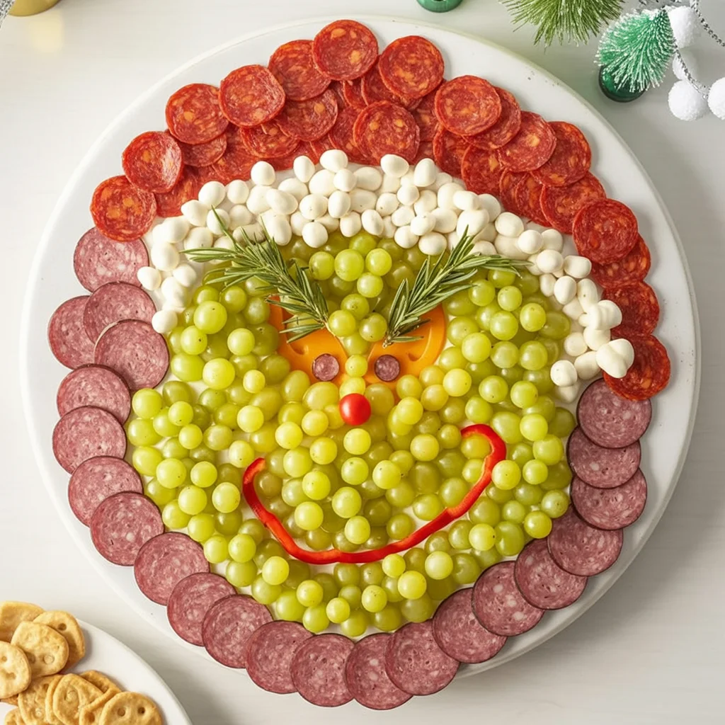 This Grinch-themed charcuterie tray creatively combines savory meats and fresh fruits to form the mischievous Grinch’s face. The base of the Grinch’s face is made up of green grapes, shaped into a rounded face and accented with an orange pepper for his eyes.