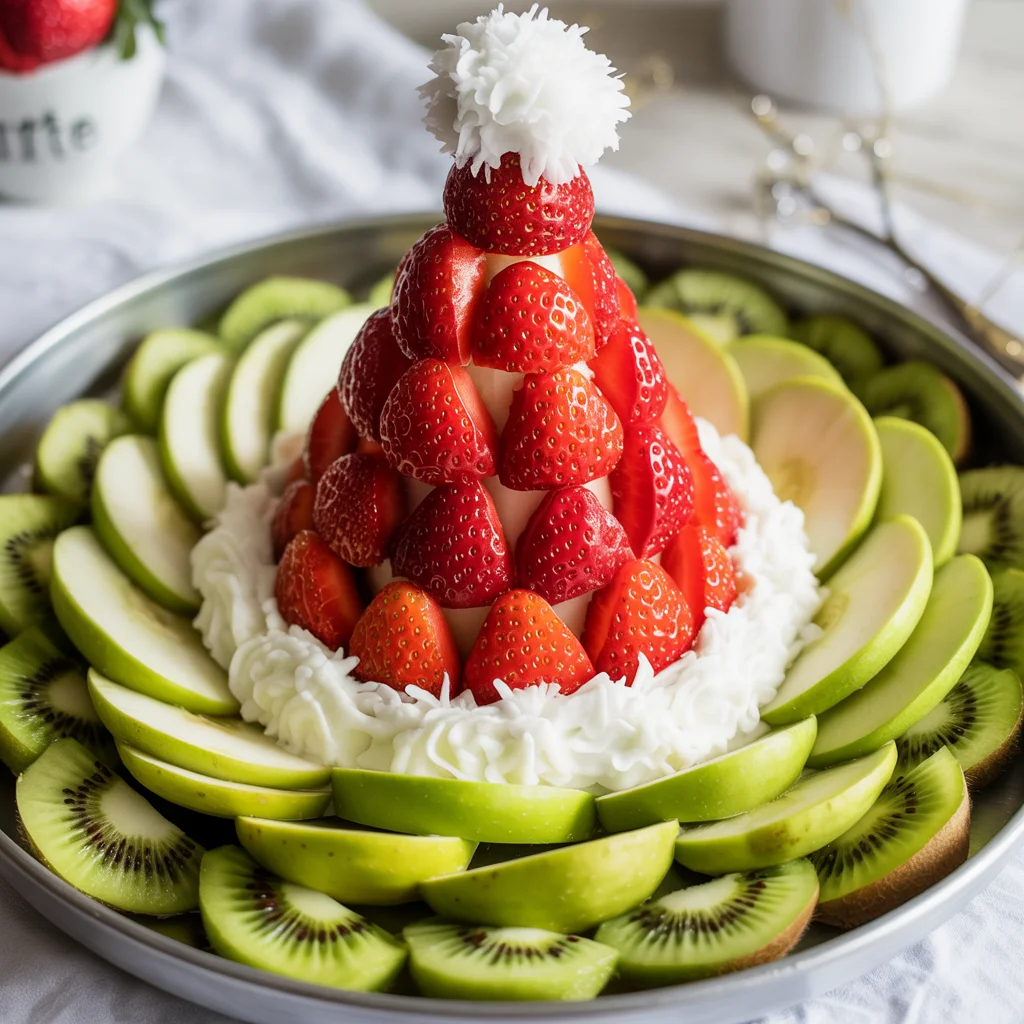 A fluffy ring of whipped cream at the base of the pyramid adds the perfect touch to the “hat,” while a coconut topping at the peak mimics the pom-pom on top. Surrounding the hat are thin slices of green apple and kiwi, creating a vibrant and healthy border that contrasts beautifully with the red strawberries.