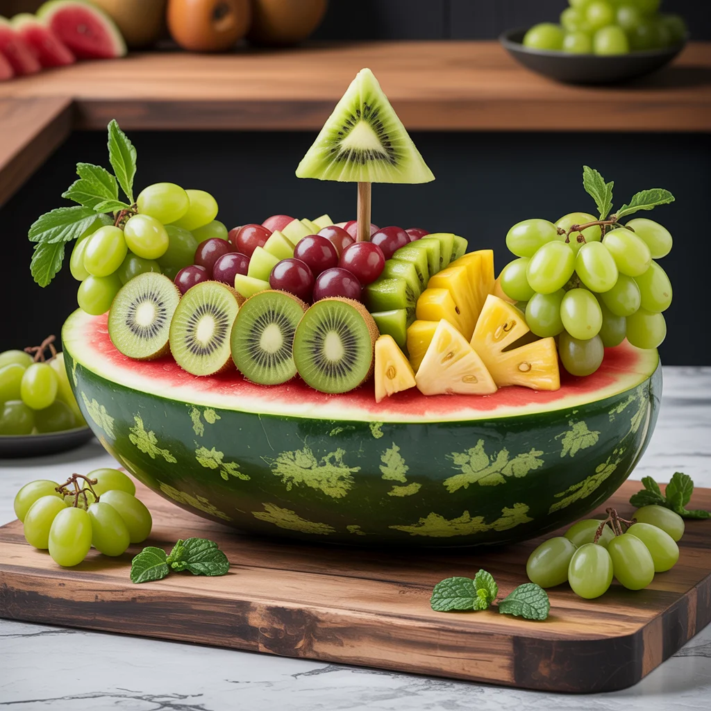 This festive fruit tray is a creative and healthy take on the Grinch theme. Using a watermelon as the base, the vibrant green skin forms the perfect contrast against the colorful, sweet fruit filling inside.