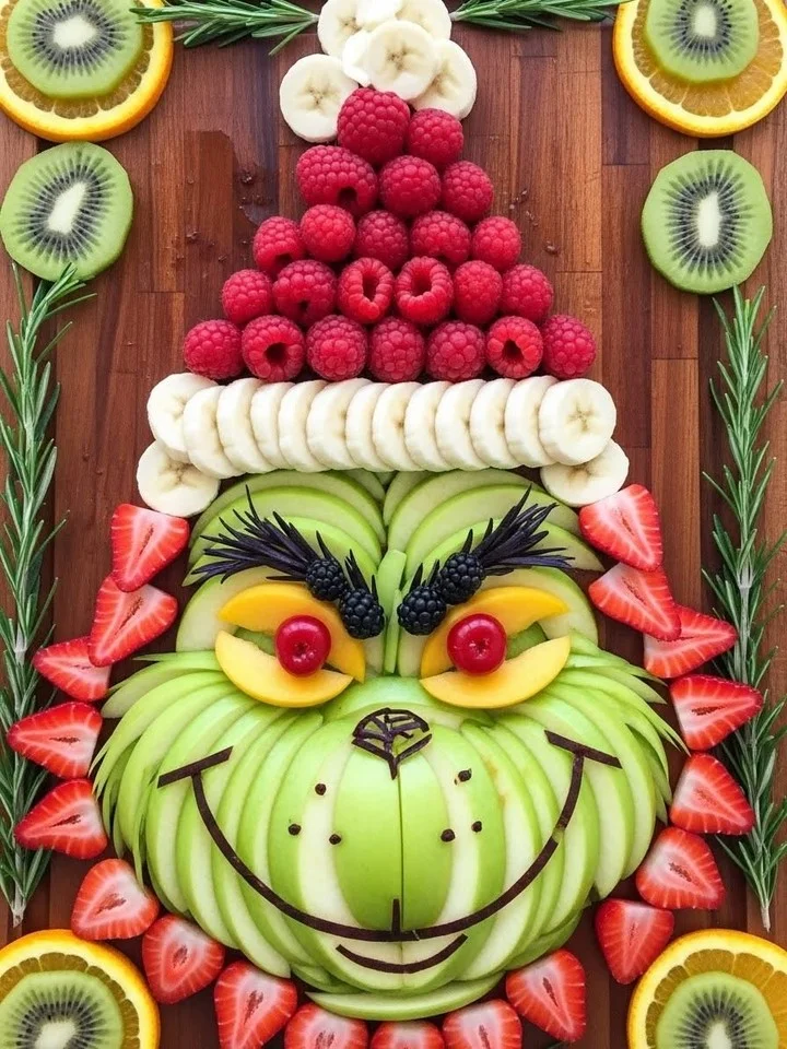 The surrounding fruits, including kiwi, orange, and strawberry slices, add vibrant color and texture to the design. Fresh rosemary sprigs enhance the festive look, resembling the Grinch’s grumpy expression.