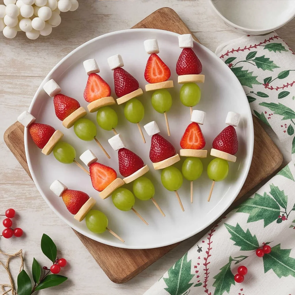 Perfect for a kids’ party or as a playful snack for guests, these fruit skewers offer a healthy option that’s both delicious and visually appealing. With the bright colors of red strawberries and green grapes, these treats are sure to bring smiles and holiday cheer to everyone!