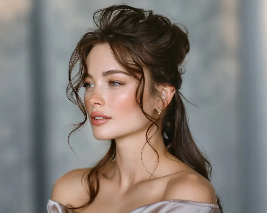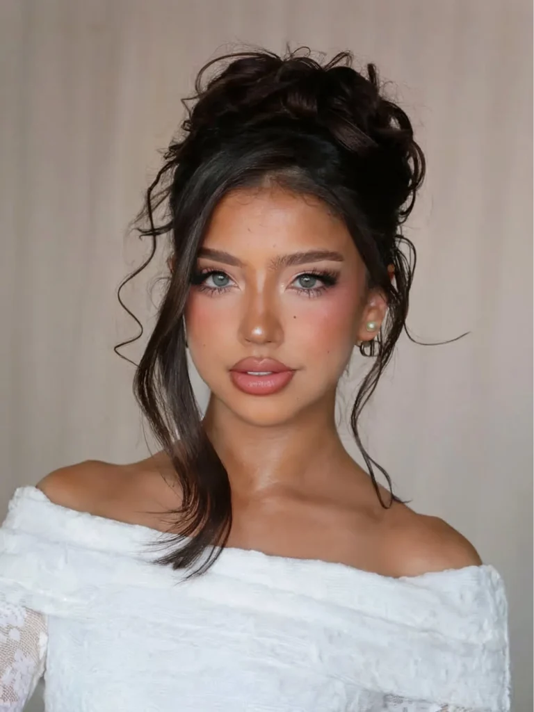 A high ponytail with soft curls adds a playful and youthful touch to your off-the-shoulder dress. It’s a perfect option if you want a more casual look while still keeping it chic and stylish.