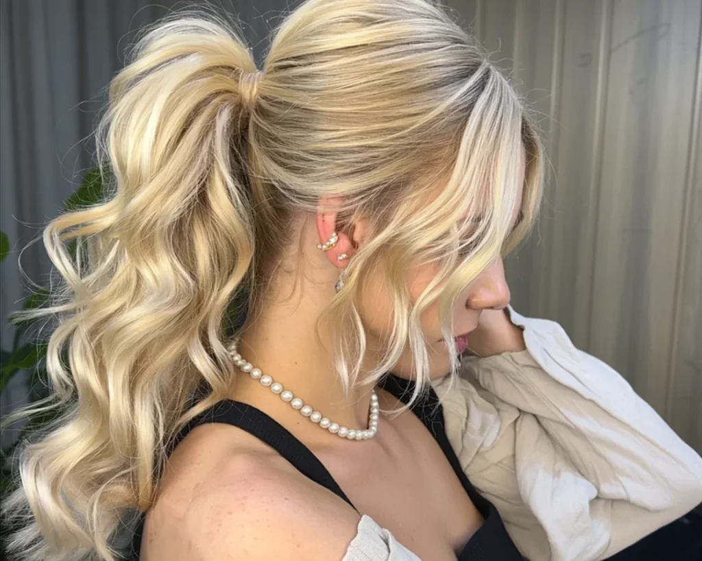 A bubble ponytail is a fun and trendy option for an off-the-shoulder dress. It’s playful, stylish, and easy to achieve, making it perfect for casual events or a day out with friends.