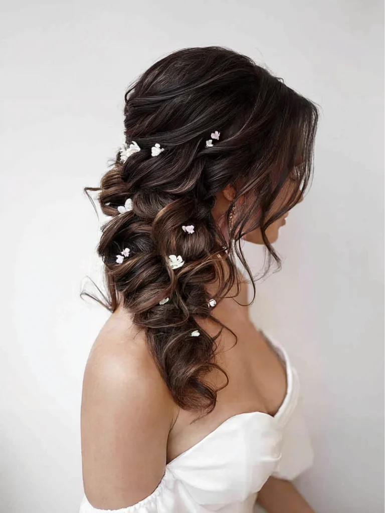 Soft, bouncy curls styled with a deep side part are perfect for creating a romantic and flattering silhouette when paired with an off-the-shoulder dress. This hairstyle gives a polished look while still feeling effortless.