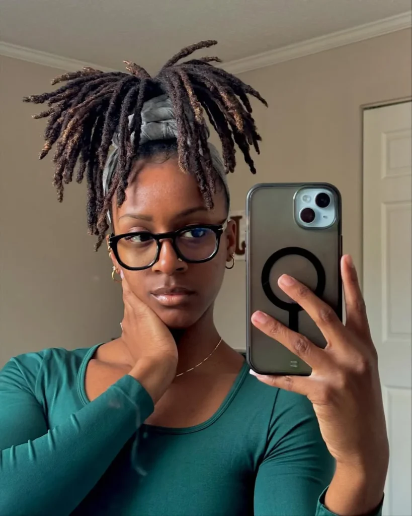 This hairstyle brings locs together into a lifted puff bun that feels neat and confident. The wrapped base keeps everything secure during long school hours.