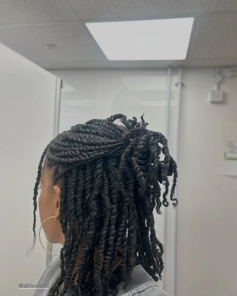 At the back, the twists are secured with a simple claw clip that adds structure without pulling the scalp. Movement in the loose twists gives the style a natural and youthful feel. It works well for students who want a tidy look without full styling.