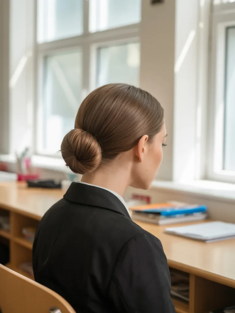 Balance comes from its simplicity and structure, giving a confident appearance without extra effort. The bun stays secure, making it a reliable option for long hours.