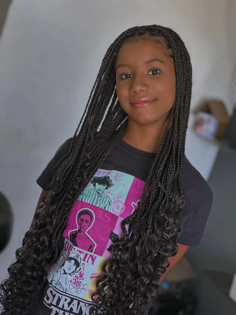 This hairstyle features neat knotless braids that flow naturally down the shoulders. The smooth braid pattern keeps the scalp comfortable and school friendly.