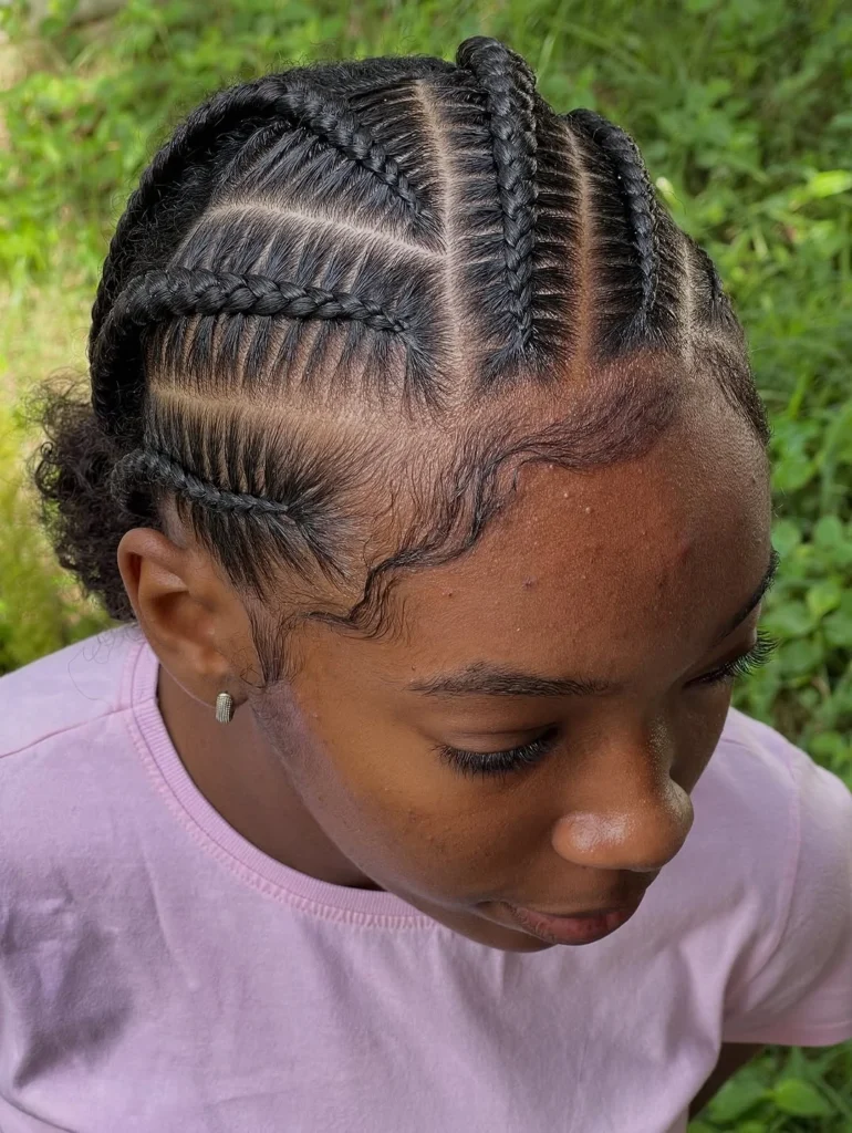 Defined cornrows create a neat and polished look that fits well into a school routine. The straight parts add structure while keeping natural 4C hair protected.
