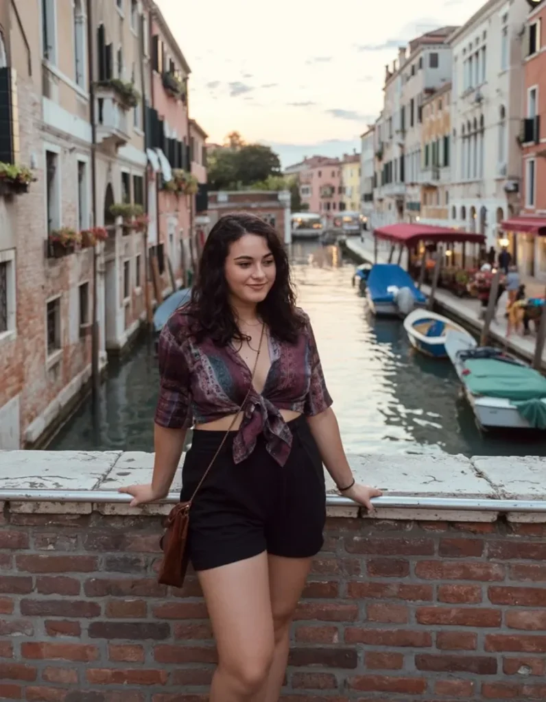 The loose fit of the shorts keeps you cool, while the breathable fabric of the top ensures comfort throughout the day. This ensemble is perfect for Venice’s warm evenings by the canal.