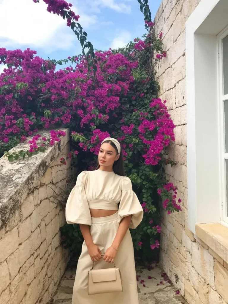 Neutral heels add sophistication, while the vibrant orange scooter in the background complements the outfit’s lively feel. This look is easygoing yet polished, perfect for Italy’s coastal towns.