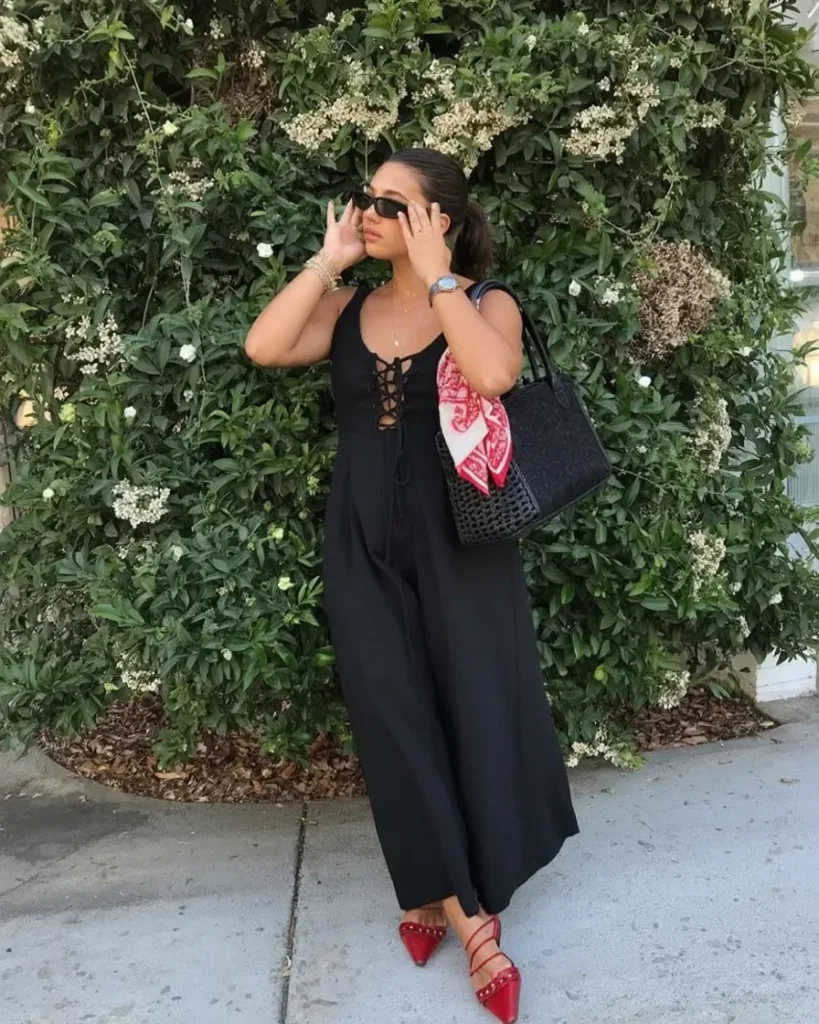 This outfit exudes confidence and style, perfect for a sunny day in Italy. The black jumpsuit with a front lace-up detail creates a flattering silhouette, making it both relaxed and edgy.