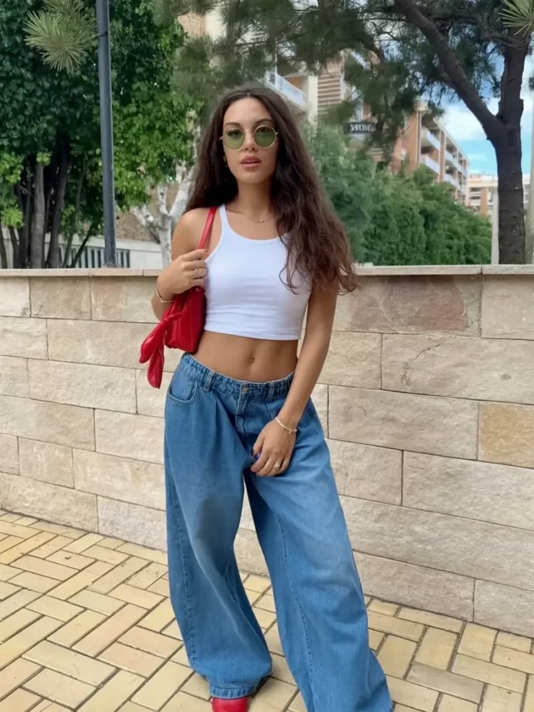 A white crop top paired with oversized denim jeans gives off an easygoing yet fashionable vibe. The loose fit of the jeans ensures comfort, while the cropped top adds a playful touch.