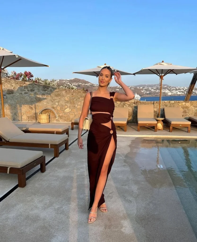 The dress’s minimalist style is paired with simple accessories, like a chic handbag and strappy sandals. These elements add elegance without taking away from the outfit’s statement design.