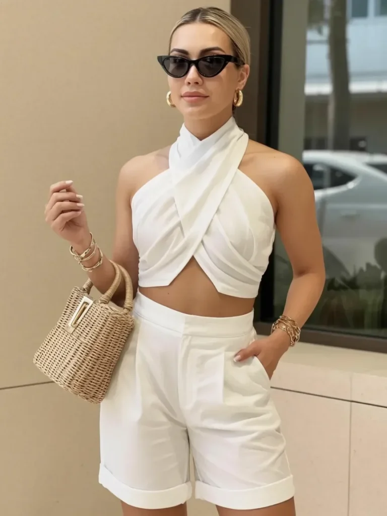 The white halter top, with its unique twist design, offers a sophisticated touch for warm Italian days. Paired with crisp white tailored shorts, this outfit strikes the balance between casual and chic.
