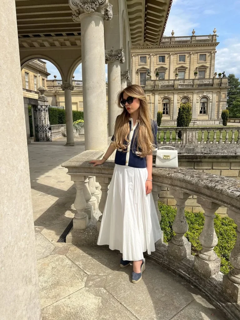 A navy top with white accents pairs beautifully with a flowing white skirt, offering a balanced, elegant look. The outfit is light and comfortable, perfect for exploring Italy’s charming streets.