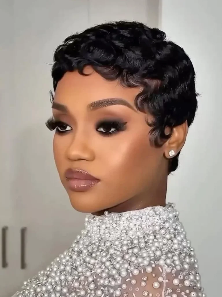 This short pixie lace frontal hairstyle highlights bold confidence with a clean and polished finish. Soft finger waves across the top add texture and movement, giving the style depth without looking heavy. Carefully shaped baby hairs frame the forehead and temples, creating a smooth and natural hairline effect.
