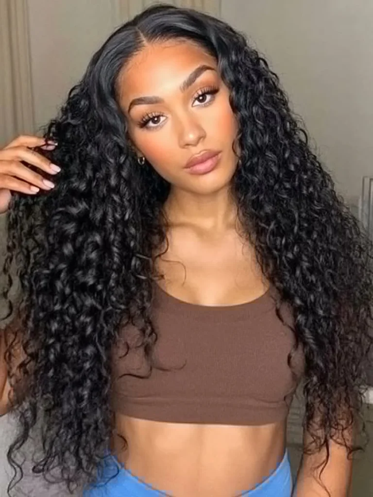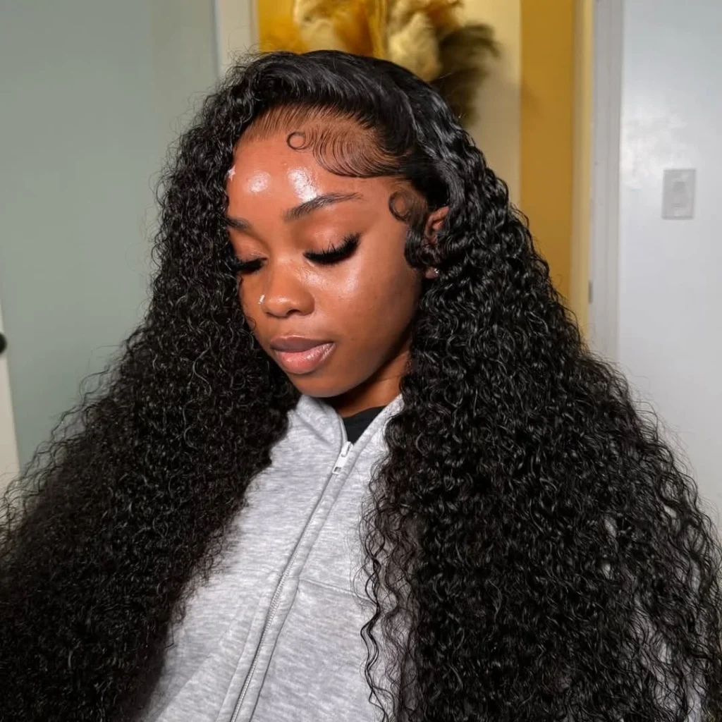 This lace frontal hairstyle showcases deep, tight curls that add fullness and natural texture to long hair. Volume starts right at the roots, giving the style a rich and defined shape that frames the face beautifully. Along the hairline, carefully styled baby hairs create soft curves that enhance realism and detail.