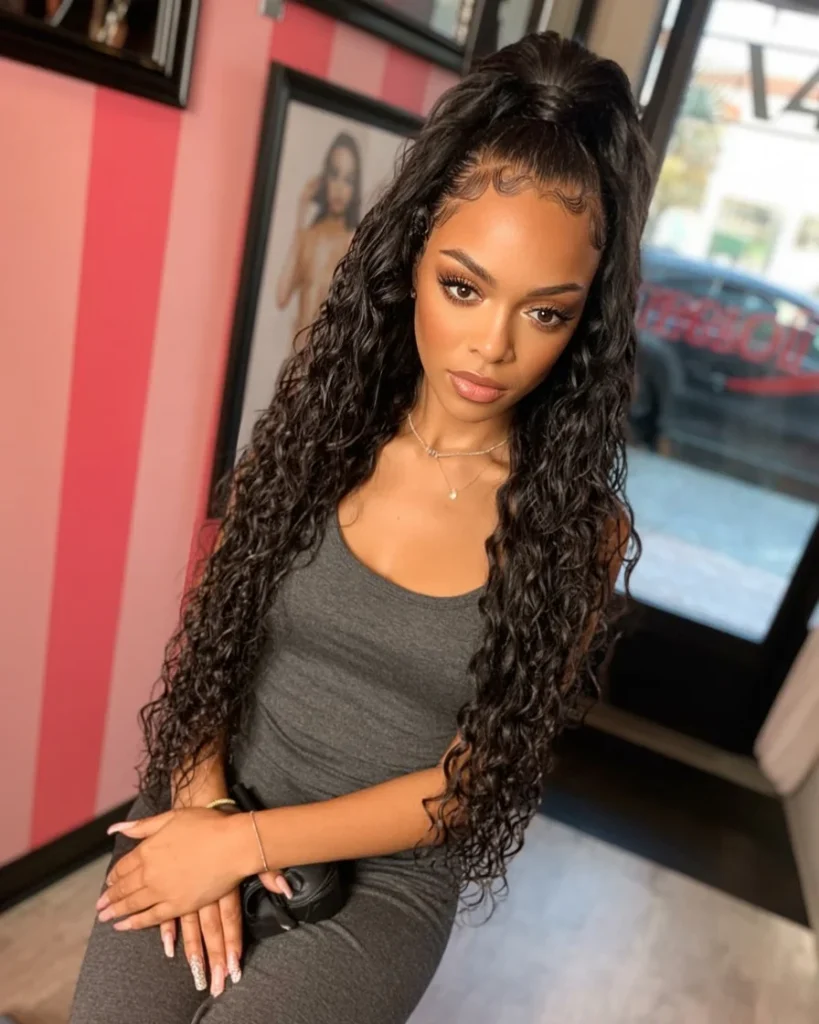 From the front, the ponytail highlights facial features and gives a confident, party ready vibe. Movement through the curls adds texture, making the hairstyle feel lively rather than stiff.