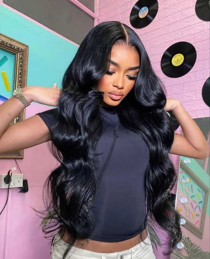 This lace frontal hairstyle showcases long body wave hair styled with rich volume and flowing movement. Soft waves cascade down the length, creating a full and glamorous appearance that instantly draws attention. A clean middle part adds balance, while the lace frontal blends smoothly into the hairline for a natural finish.