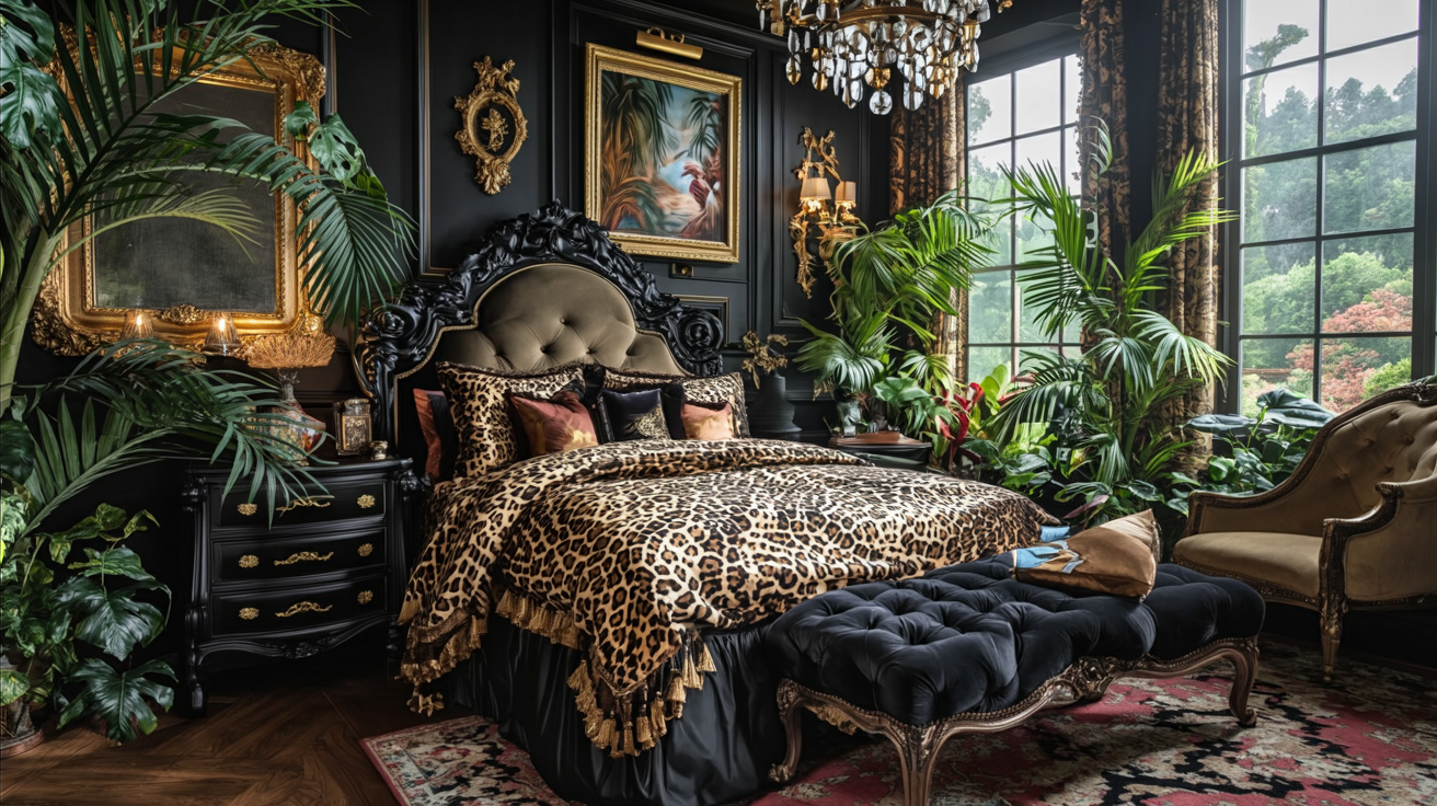 This bedroom showcases a captivating blend of opulence and wild elegance with a bold leopard print duvet and matching rug. The rich, dark walls enhance the dramatic print, while the golden accents on the pillows and furniture introduce a touch of luxury.