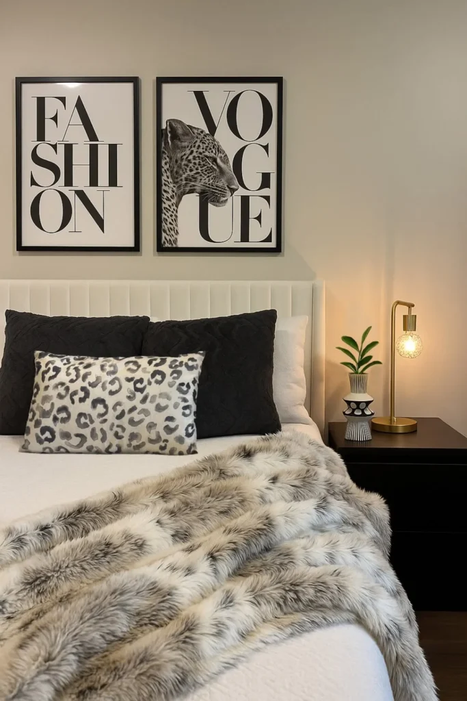 This bedroom exudes sophistication with a touch of boldness, featuring a luxe leopard print bedding set that brings warmth and texture to the room. The print on the blanket contrasts beautifully with the neutral tones of the pillows, creating a balance between wild and calming elements.