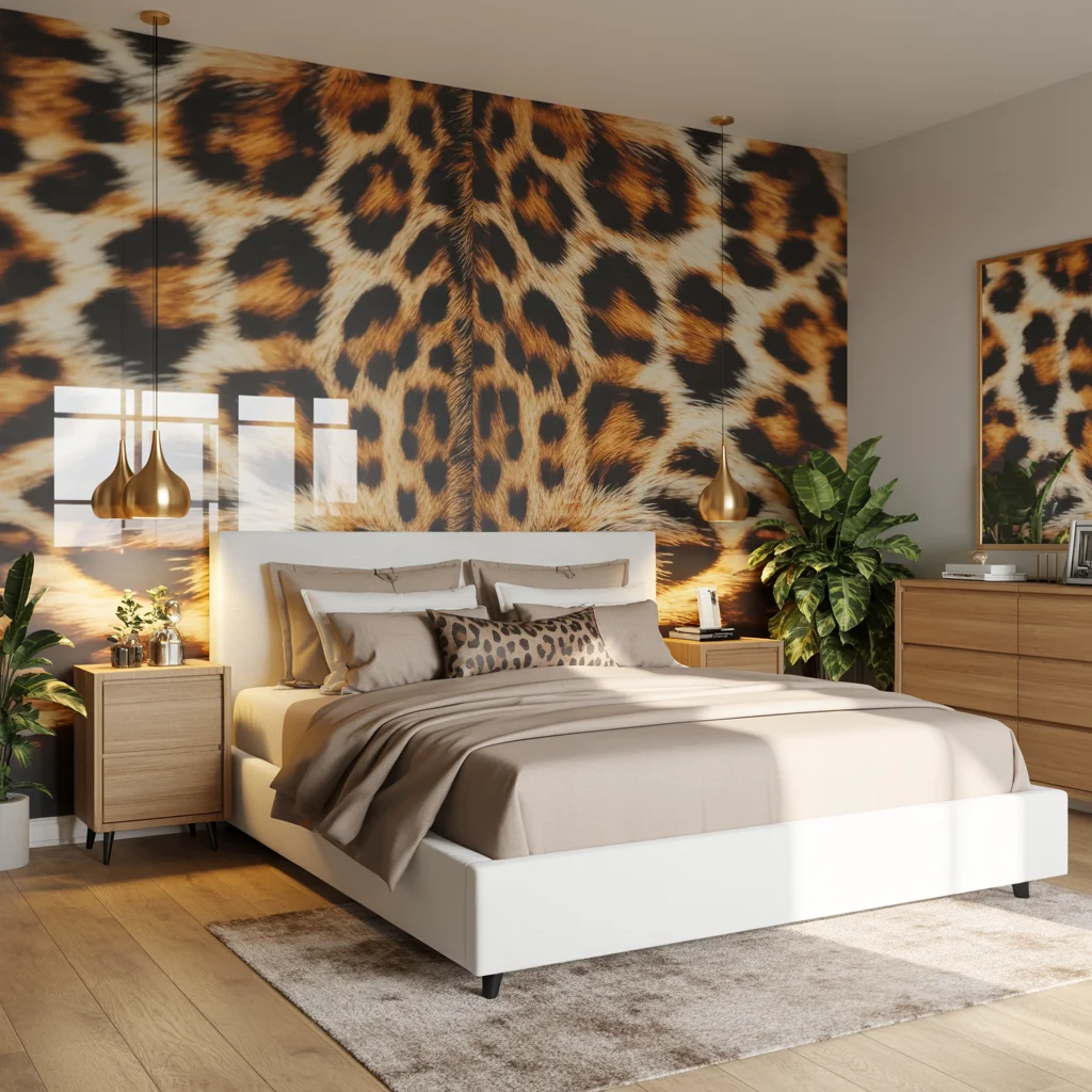 This modern bedroom brings a bold touch of animal print with a striking leopard print feature wall that serves as the room’s focal point. The soft neutral bedding in beige tones balances the vibrant design, creating a harmonious look.