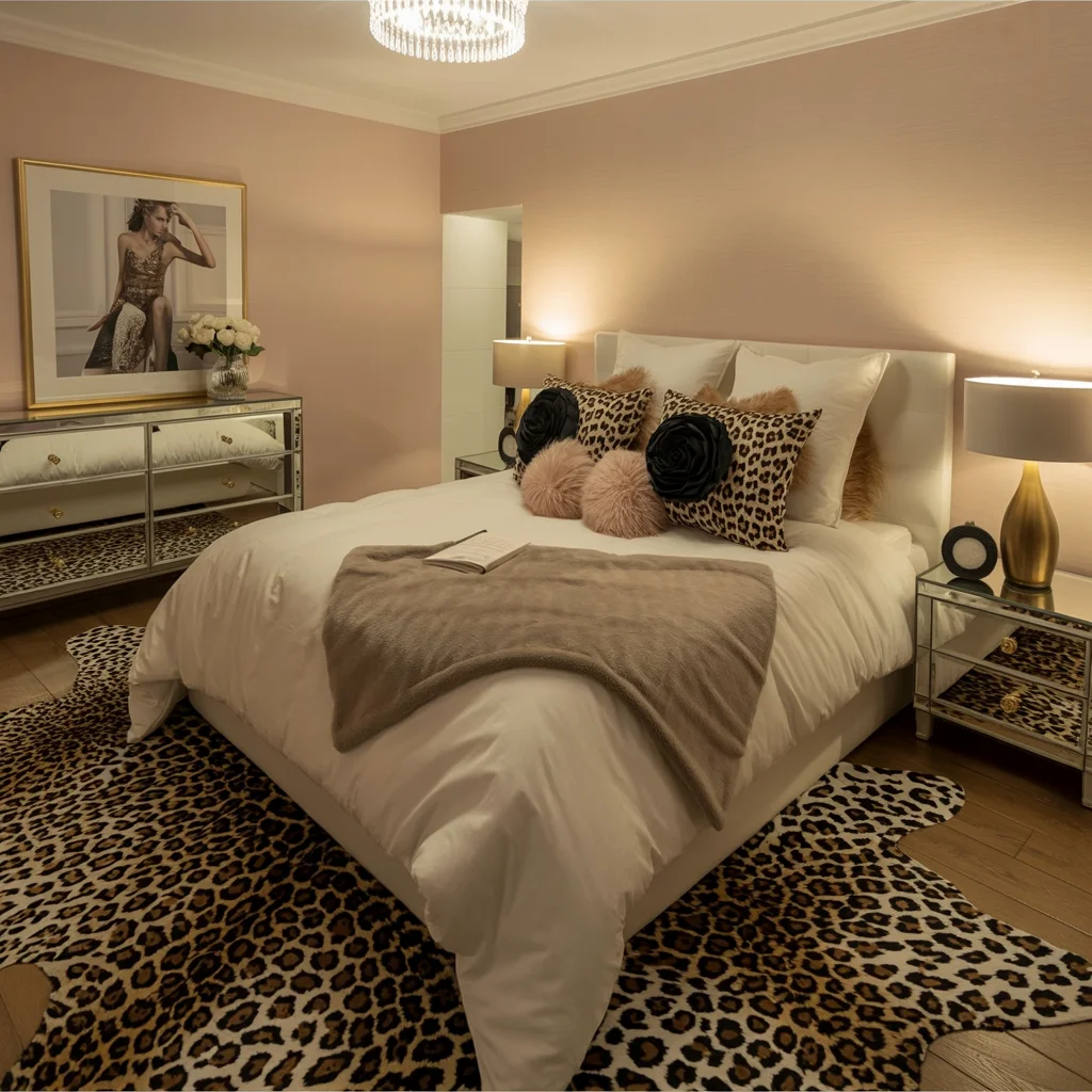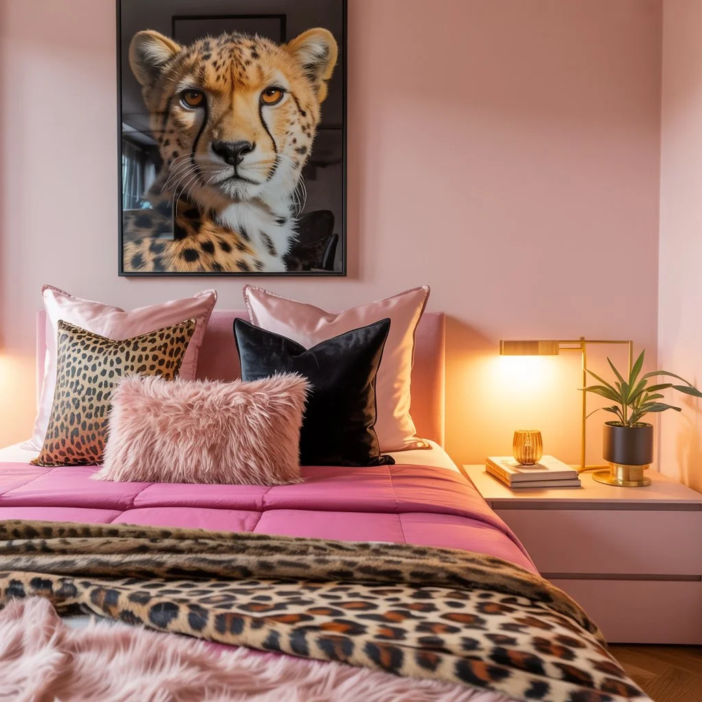 This bedroom is a stylish fusion of bold leopard print and soft pink tones. The playful combination of textured leopard print pillows paired with fluffy pink accents creates a cozy yet chic look.